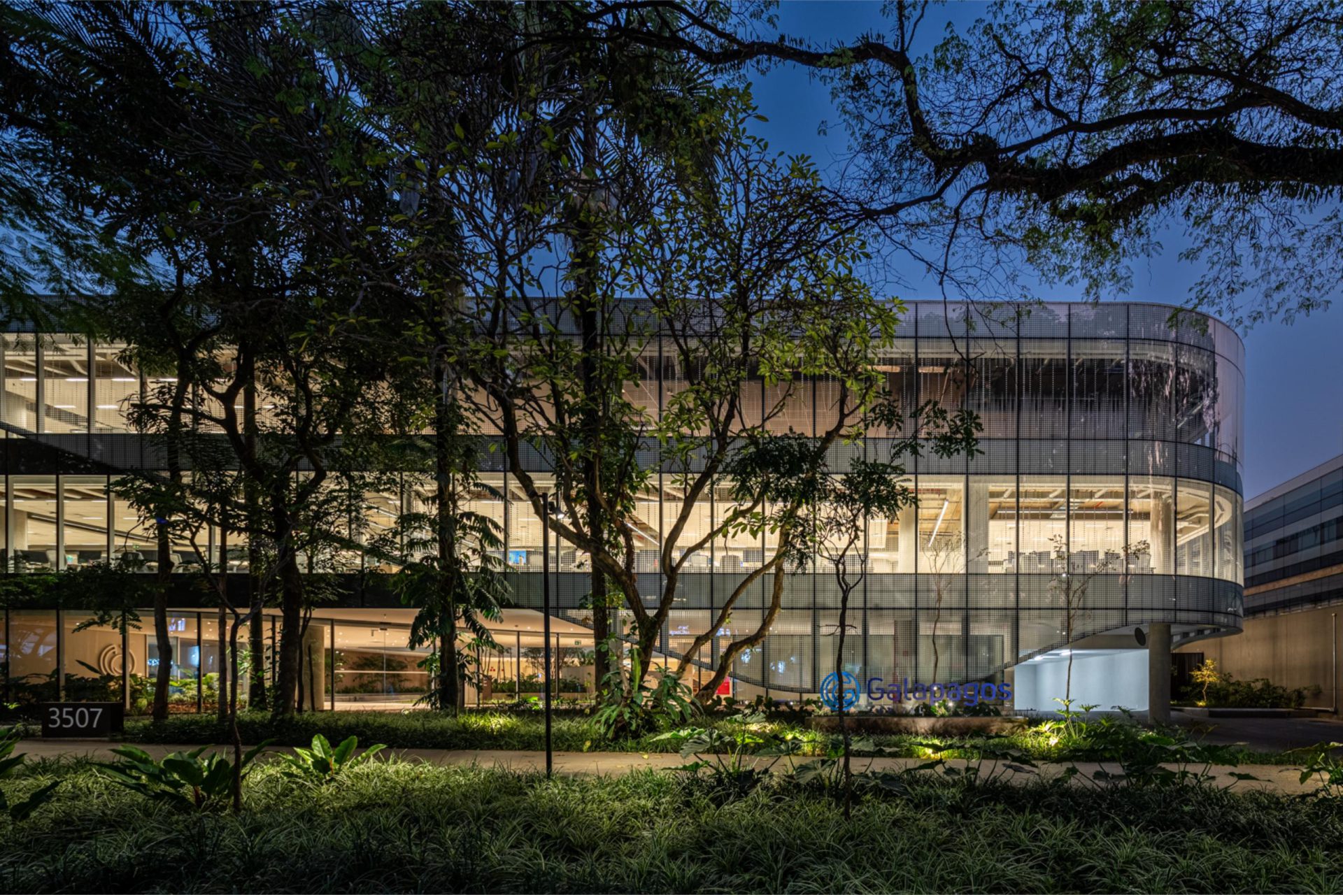The glass envelope features a parametric-screened pattern that responds to solar incidence on each orientation. It filters sunlight, protecting the interior from excessive heat and glare, while creating a mosaic of shadows that decorates the workspaces.