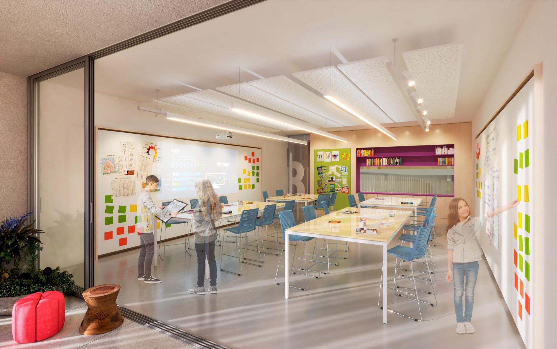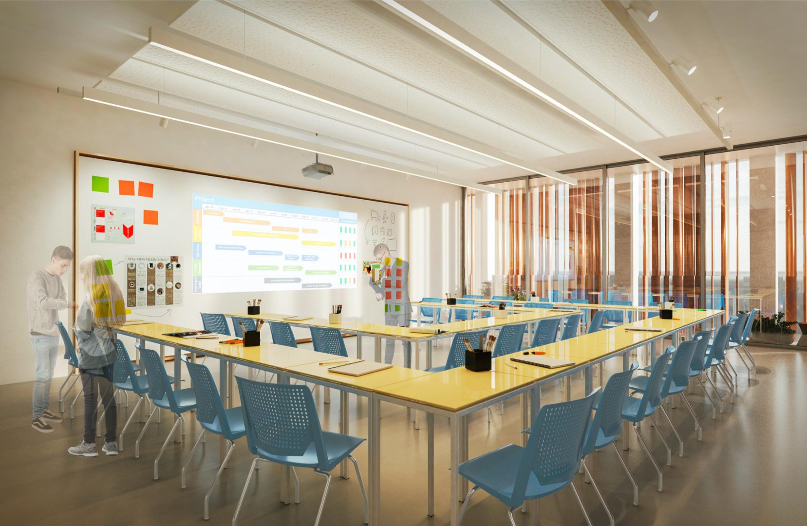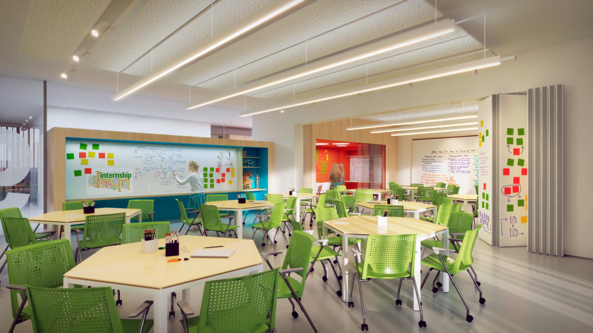 Um átrio central cria uma conexão visual e permite aos usuários entenderem o espaço como um todo. Rampas e travessias em diferentes níveis oferecem uma circulação interessante. As salas de aula, modulares e flexíveis, encorajam diferentes configurações, podendo ter seu tamanho aumentado ou reduzido, acomodando diversos grupos e maneiras de ensinar. “Incubadoras” servem como espaços que se moldam à necessidade do momento, podendo servir como uma extensão da sala de aula ou como áreas separadas de concentração e foco dos estudantes. Salas de colaboração e criação criam um ambiente de aprendizado aberto, experimental e acolhedor.