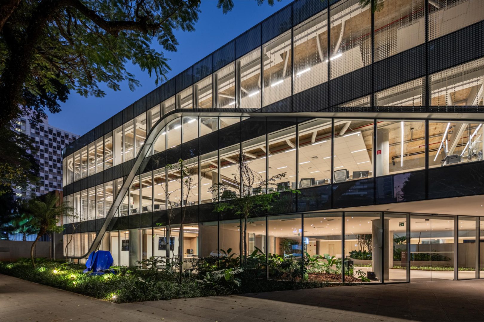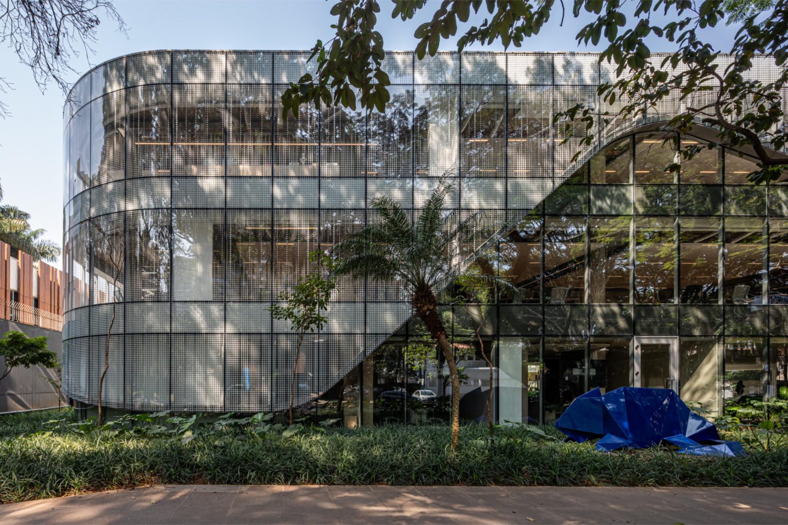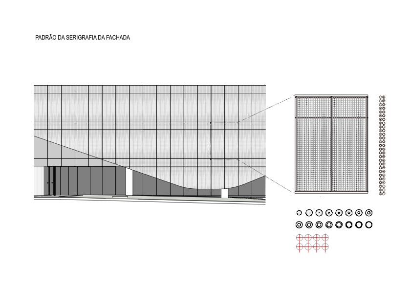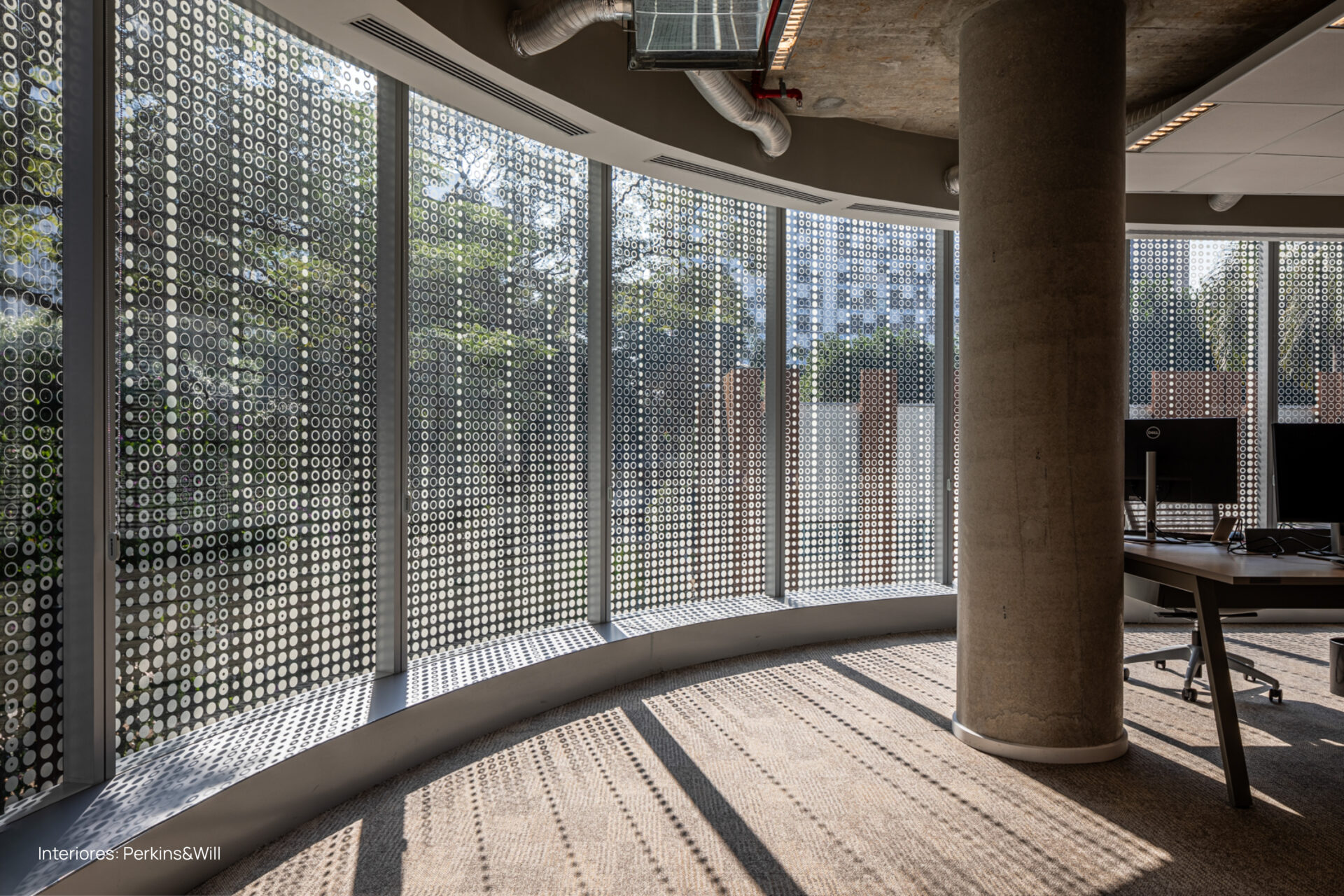 A serigrafia do envelope de vidro segue uma padronização paramétrica, respondendo à incidência solar em cada uma das orientações. Ela filtra a luz solar, protegendo o interior do calor excessivo e da ofuscação, além de criar um mosaico de sombras que enfeita os espaços de trabalho.