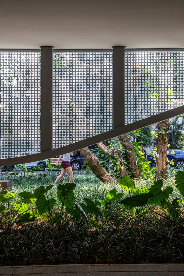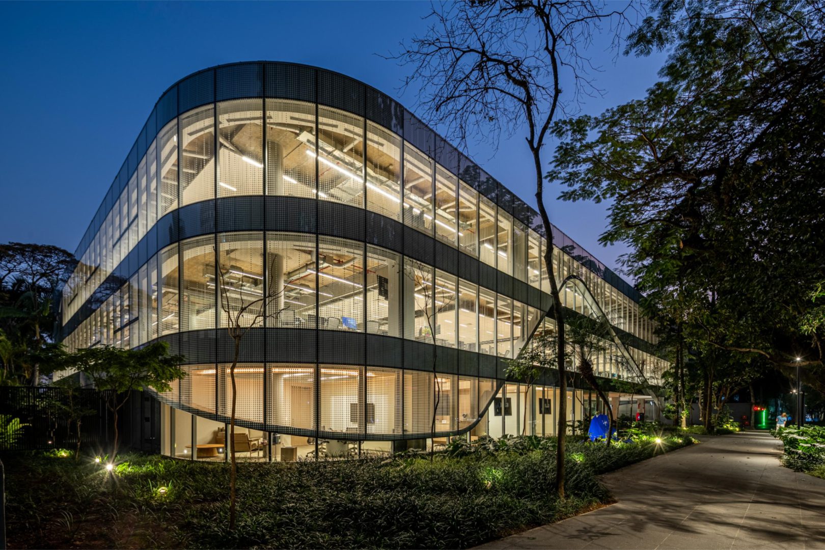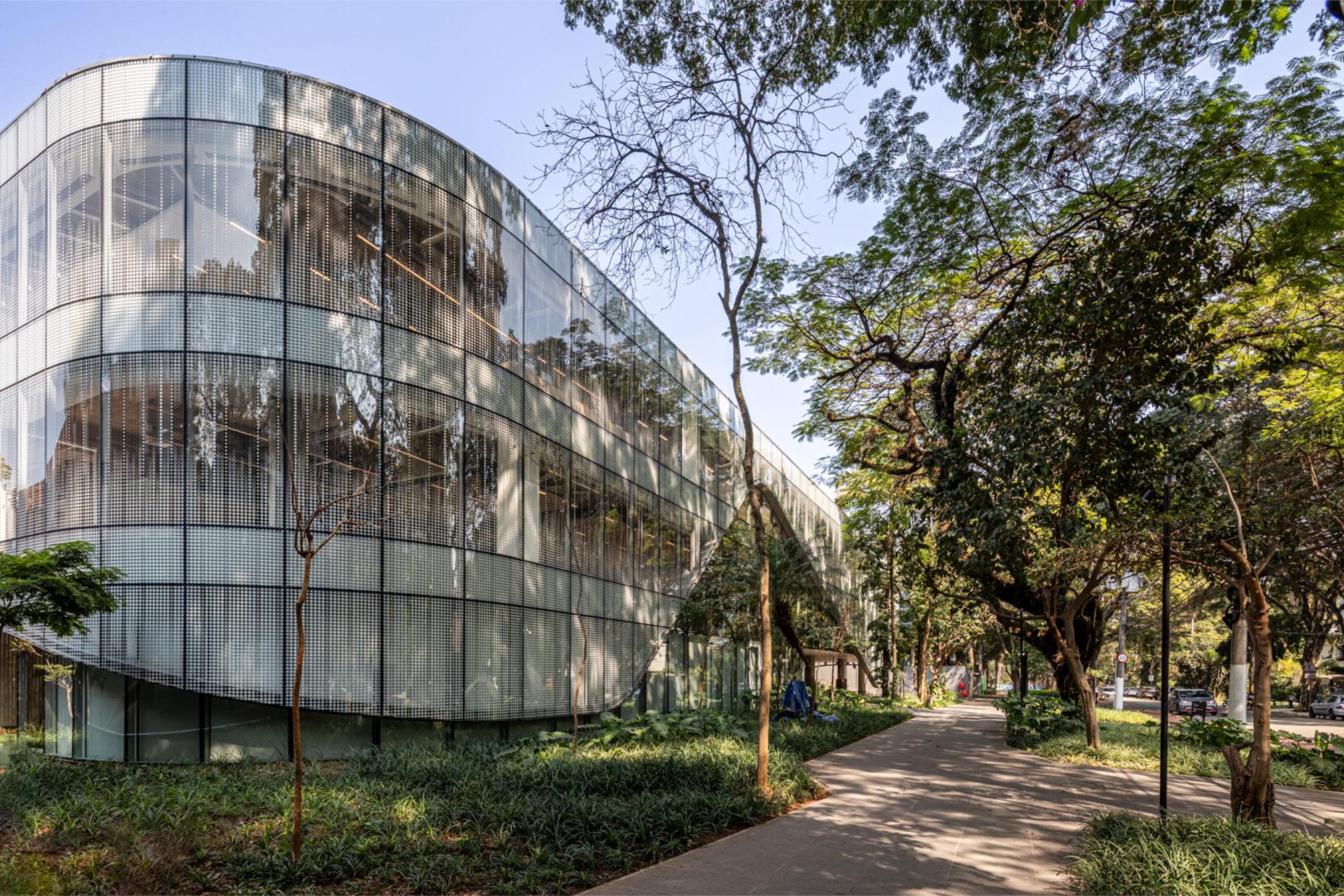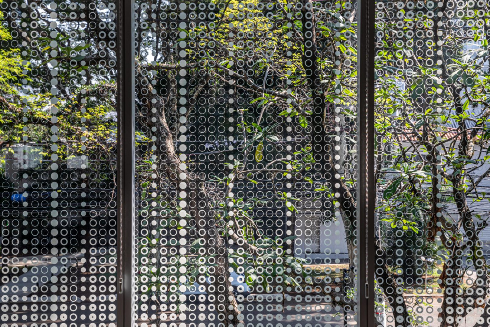 A serigrafia do envelope de vidro segue uma padronização paramétrica, respondendo à incidência solar em cada uma das orientações. Ela filtra a luz solar, protegendo o interior do calor excessivo e da ofuscação, além de criar um mosaico de sombras que enfeita os espaços de trabalho.