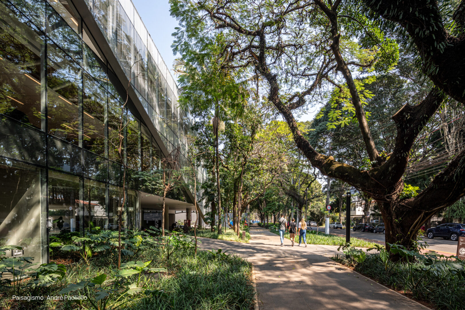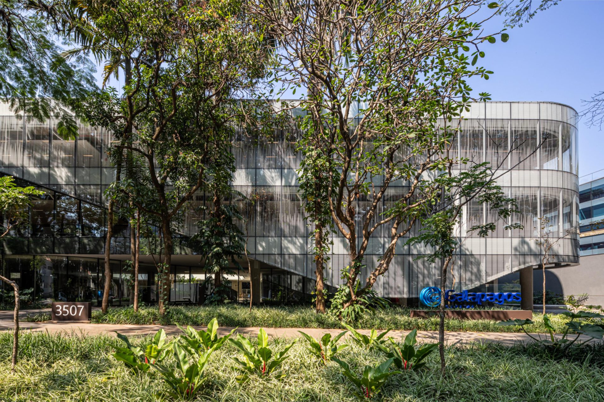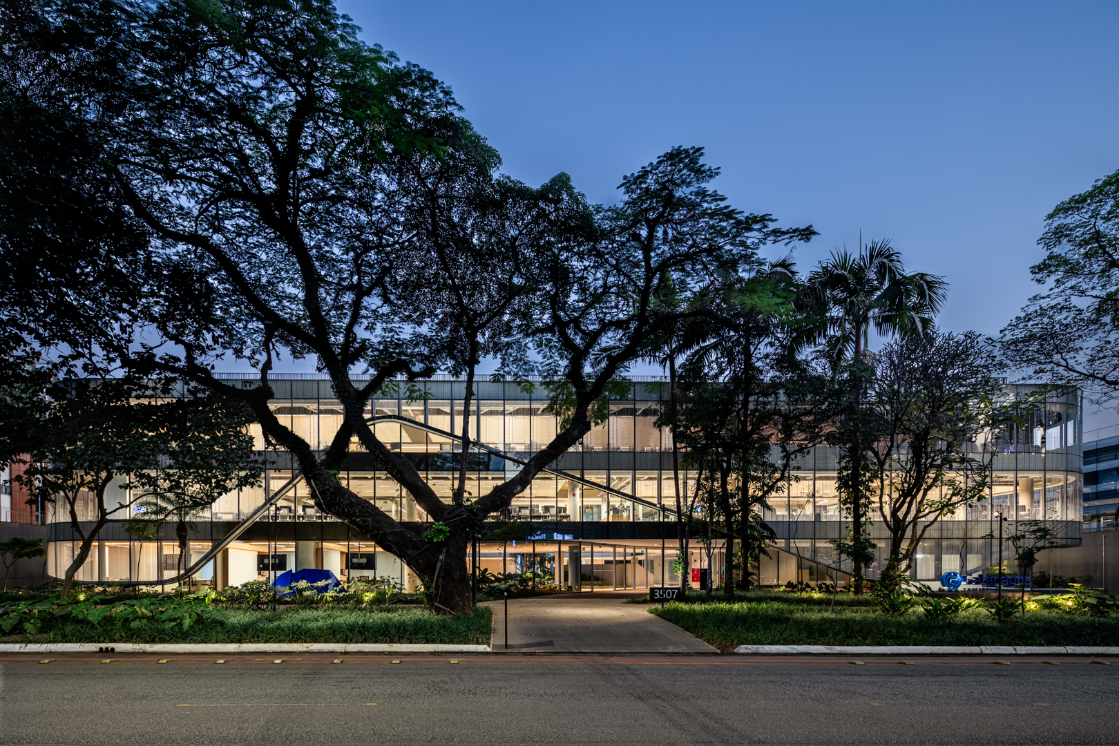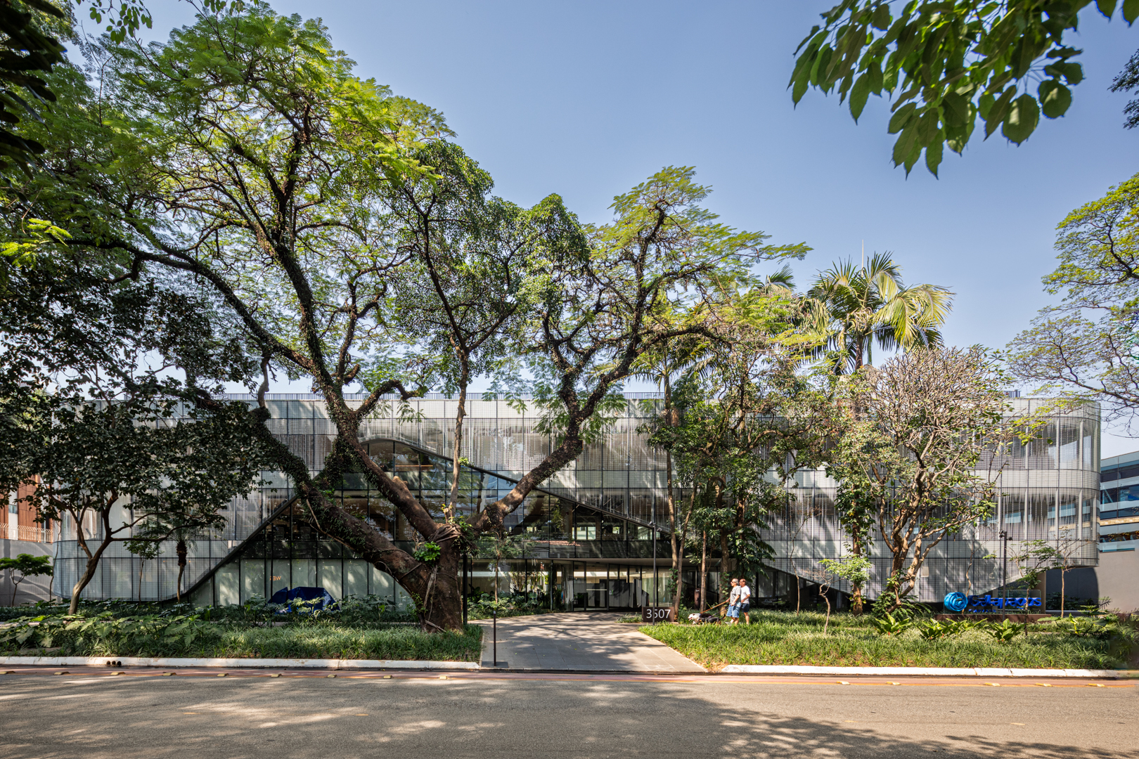 A serigrafia do envelope de vidro segue uma padronização paramétrica, respondendo à incidência solar em cada uma das orientações. Ela filtra a luz solar, protegendo o interior do calor excessivo e da ofuscação, além de criar um mosaico de sombras que enfeita os espaços de trabalho.