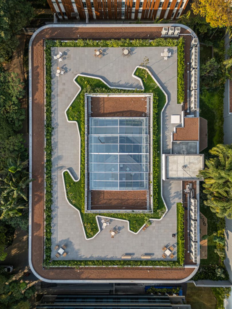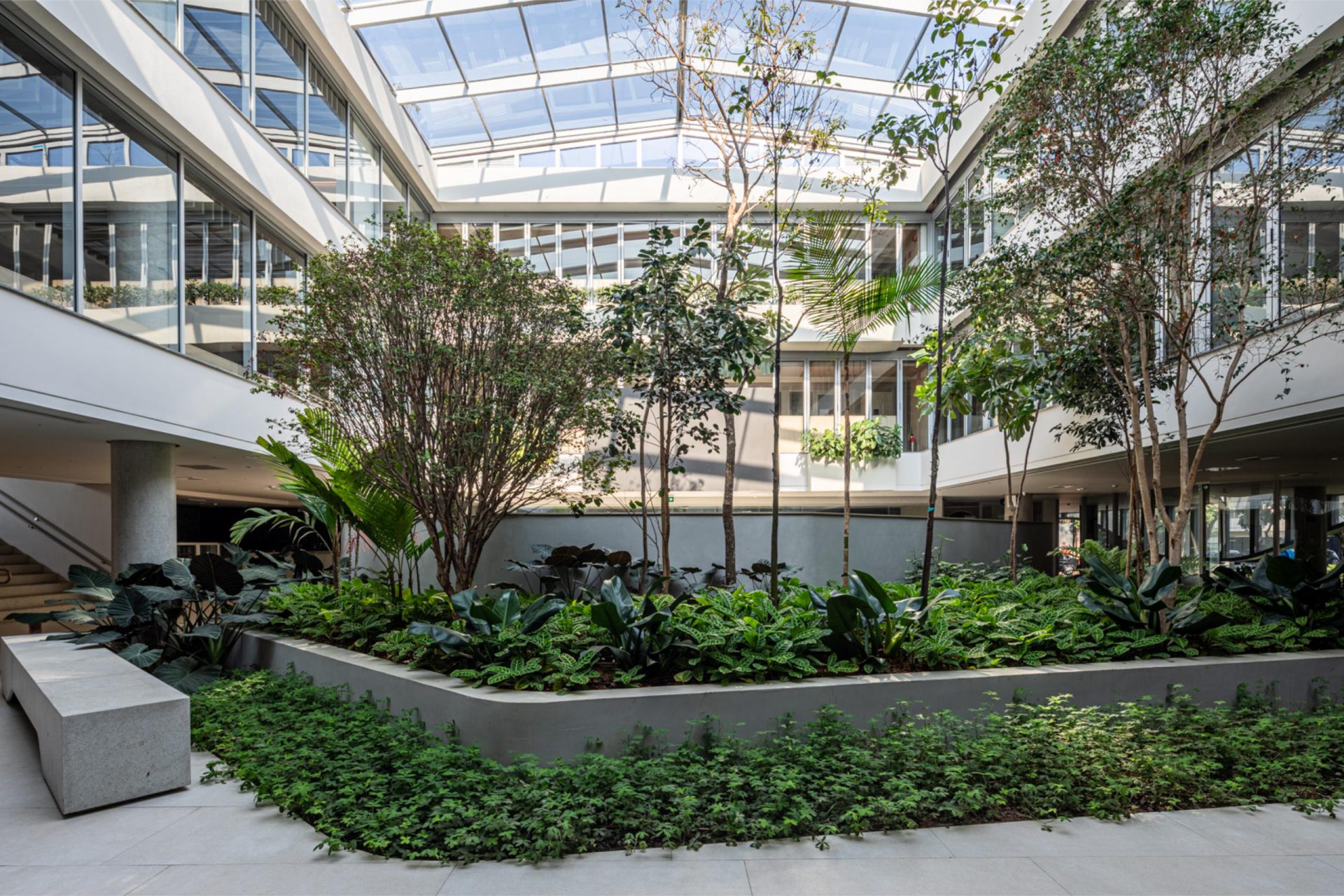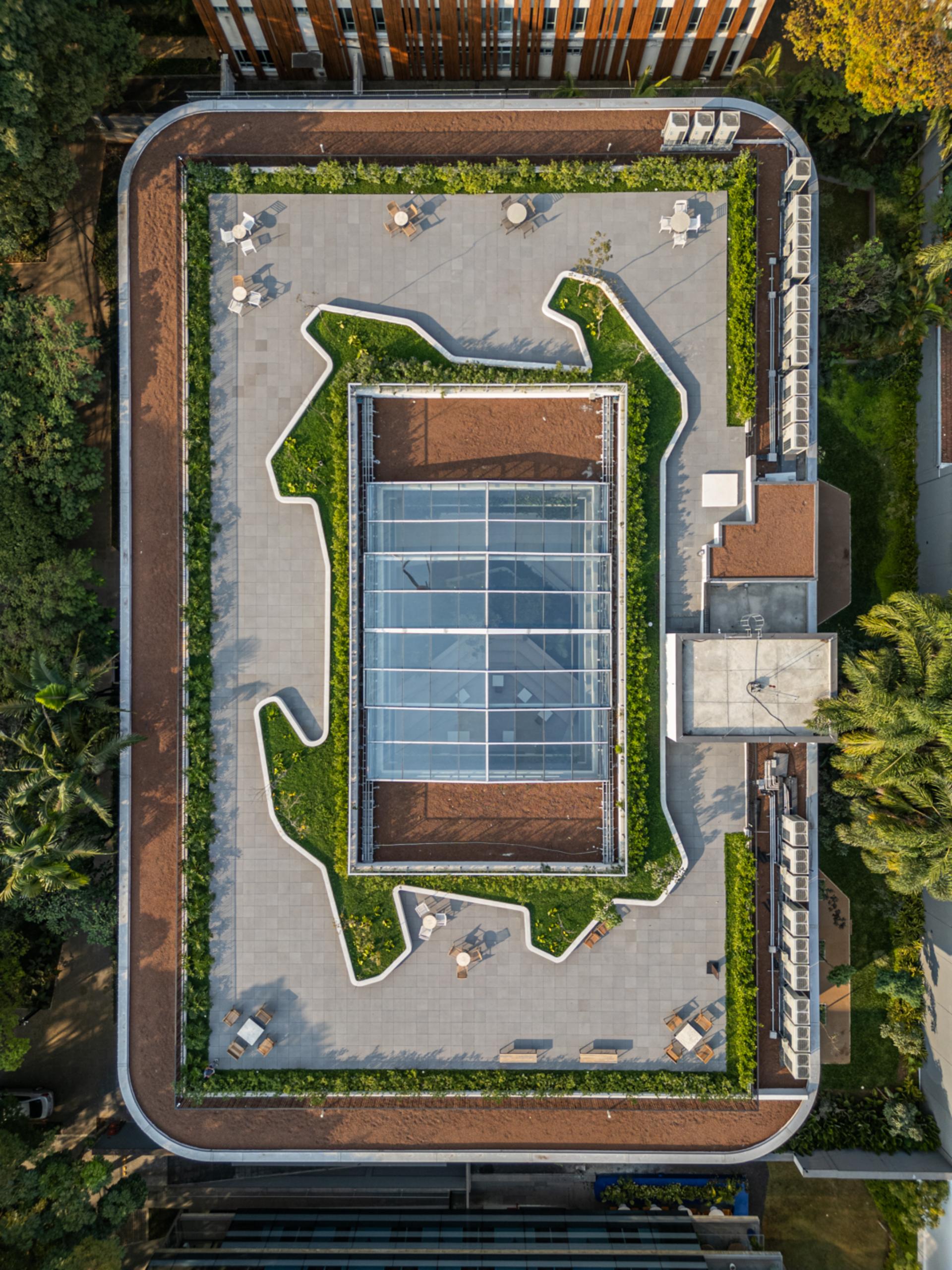 Organizado ao redor de um pátio central, o edifício oferece uma forte conexão entre interior e exterior e borra os limites de cada um. O pátio, com intensa presença de vegetação, serve como uma área de descanso e socialização, aprimorando o ambiente de trabalho. Uma cobertura de vidro permite que ele seja usado em qualquer circunstância, e reflita para dentro do edifício as condições meteorológicas atuais.