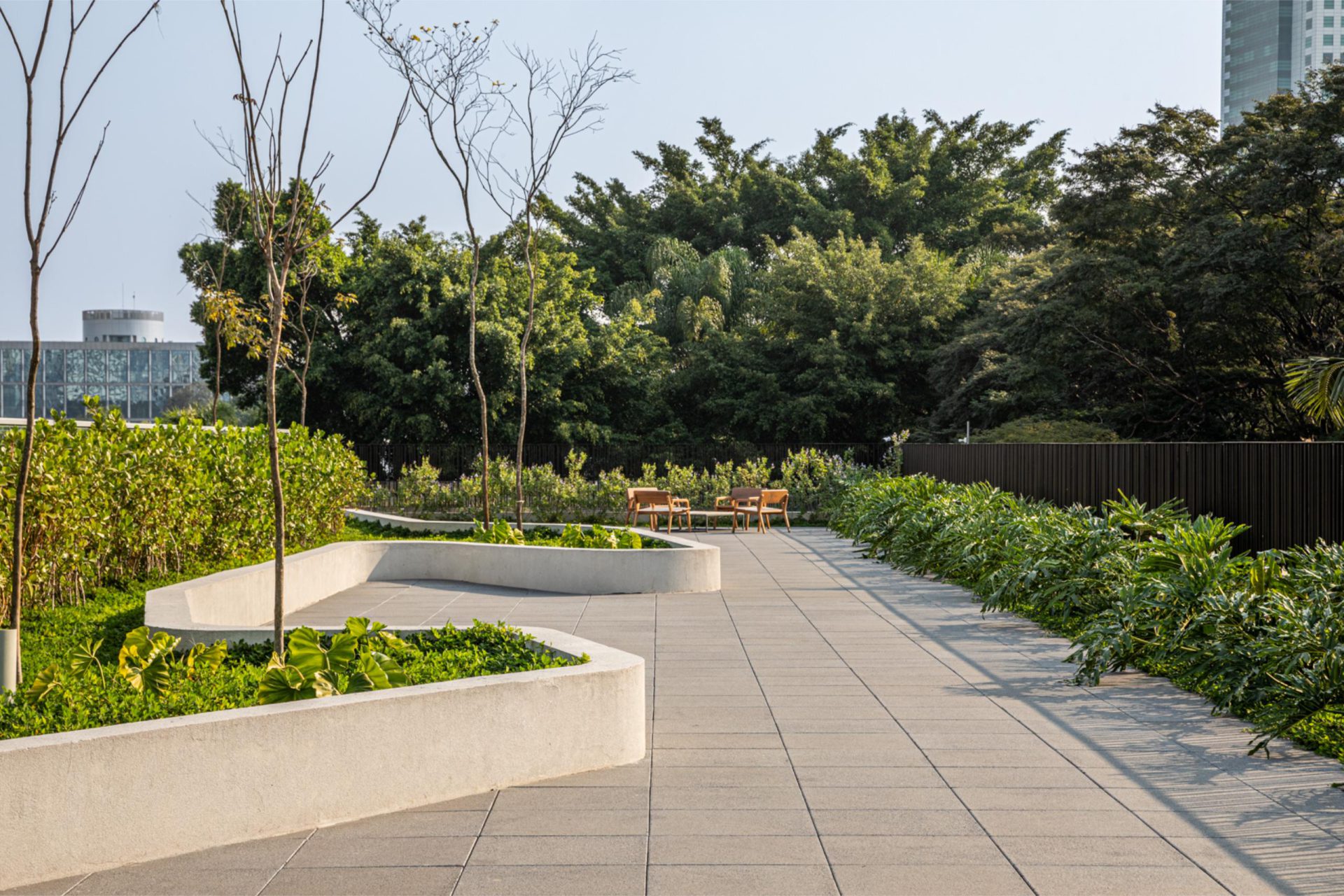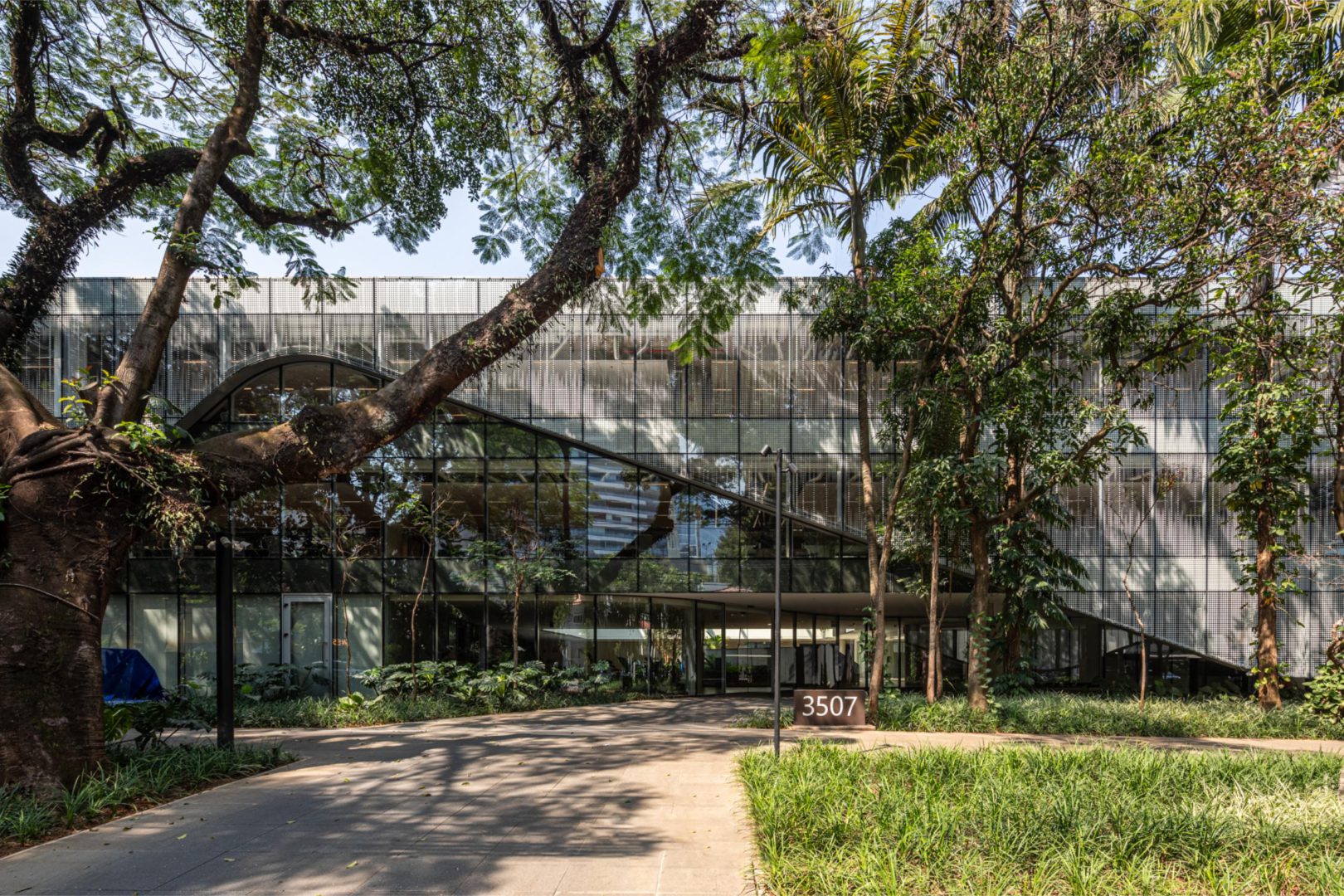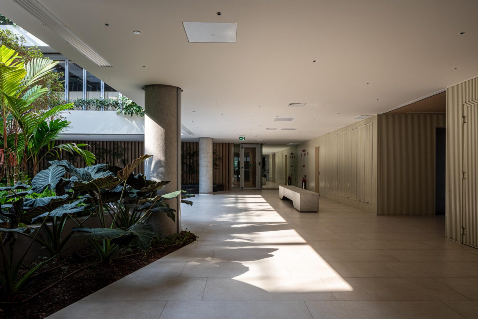 Organizado ao redor de um pátio central, o edifício oferece uma forte conexão entre interior e exterior e borra os limites de cada um. O pátio, com intensa presença de vegetação, serve como uma área de descanso e socialização, aprimorando o ambiente de trabalho. Uma cobertura de vidro permite que ele seja usado em qualquer circunstância, e reflita para dentro do edifício as condições meteorológicas atuais.