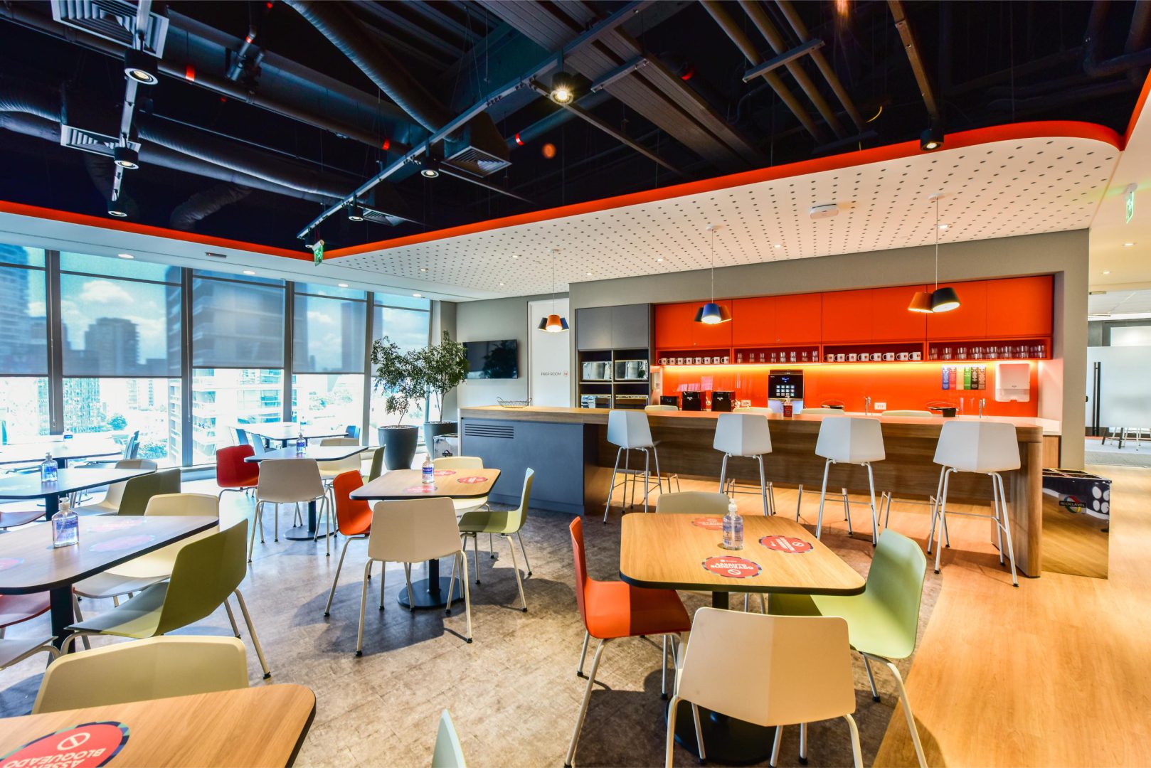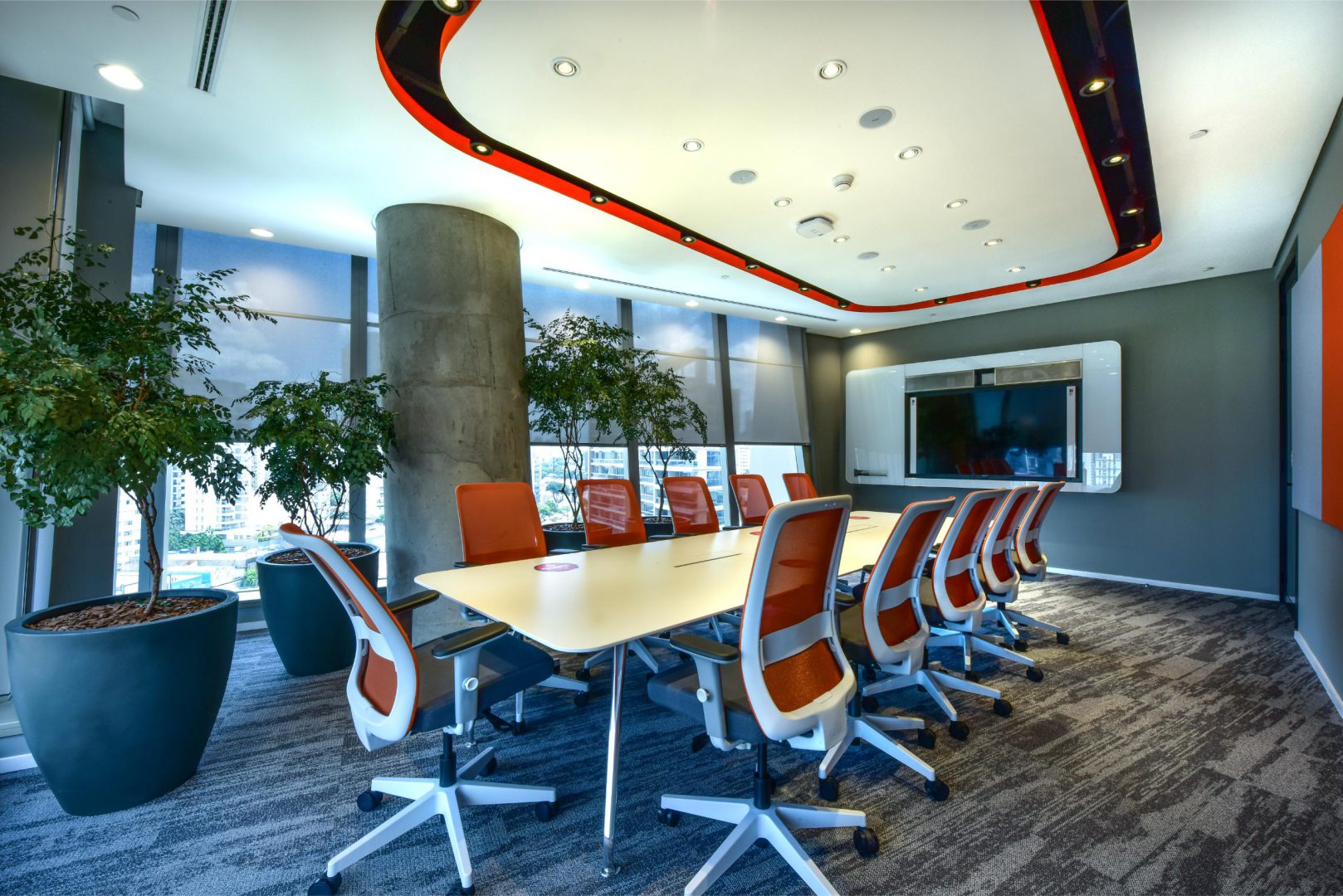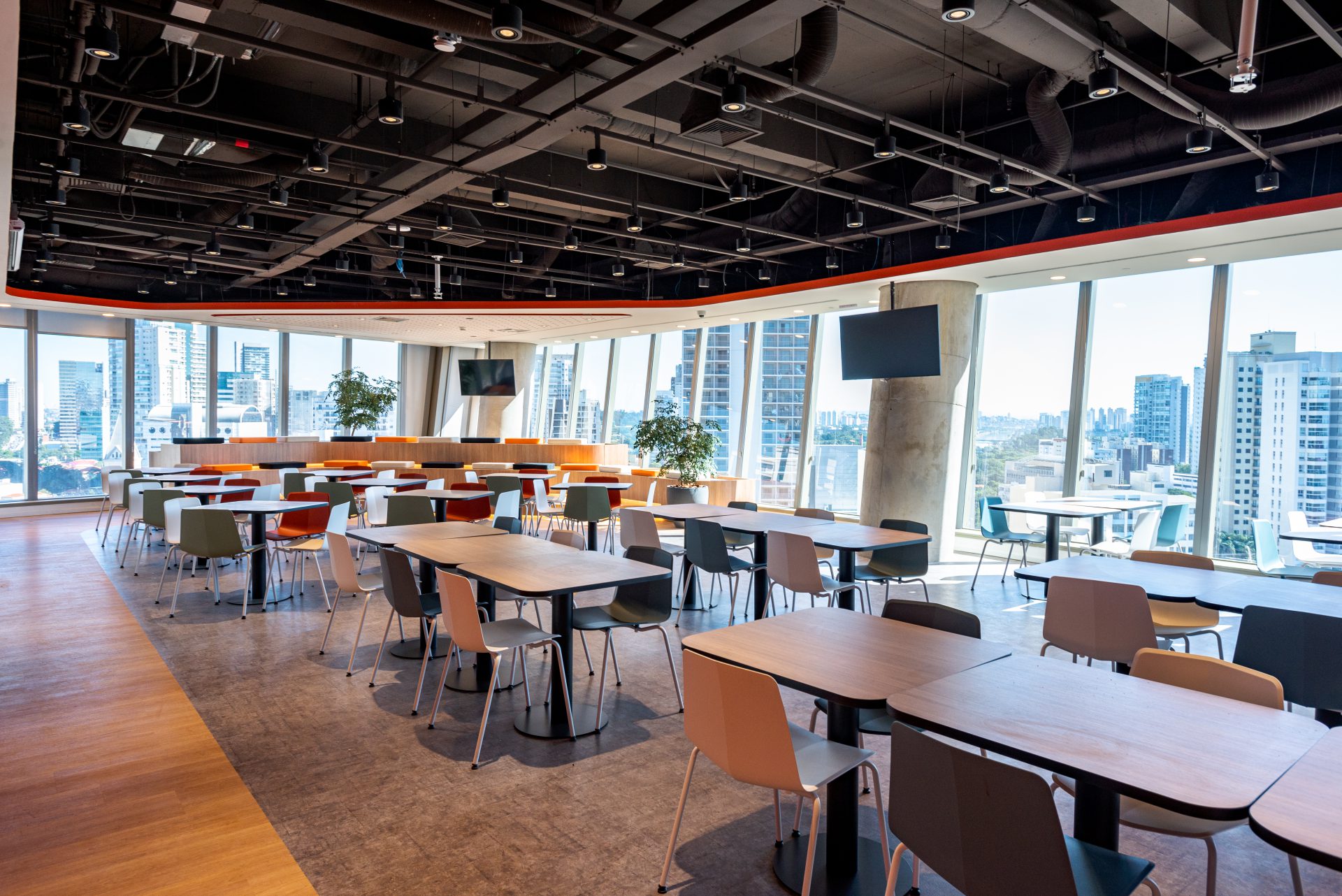 O sistema de áudio, vídeo e iluminação das salas de reunião, auditórios e refeitório é completo, para proporcionar uma experiência de conexão surpreendente. As salas de reunião possuem sistema digital de agendamento.