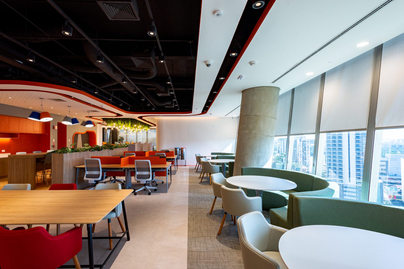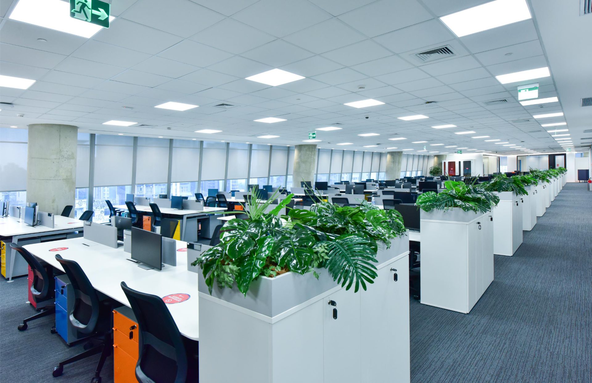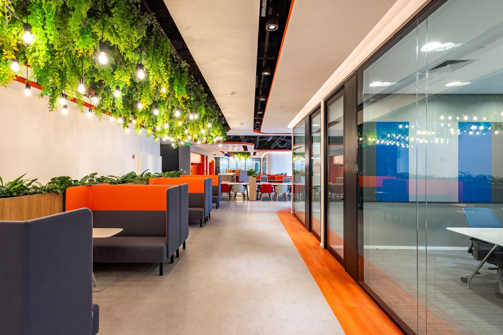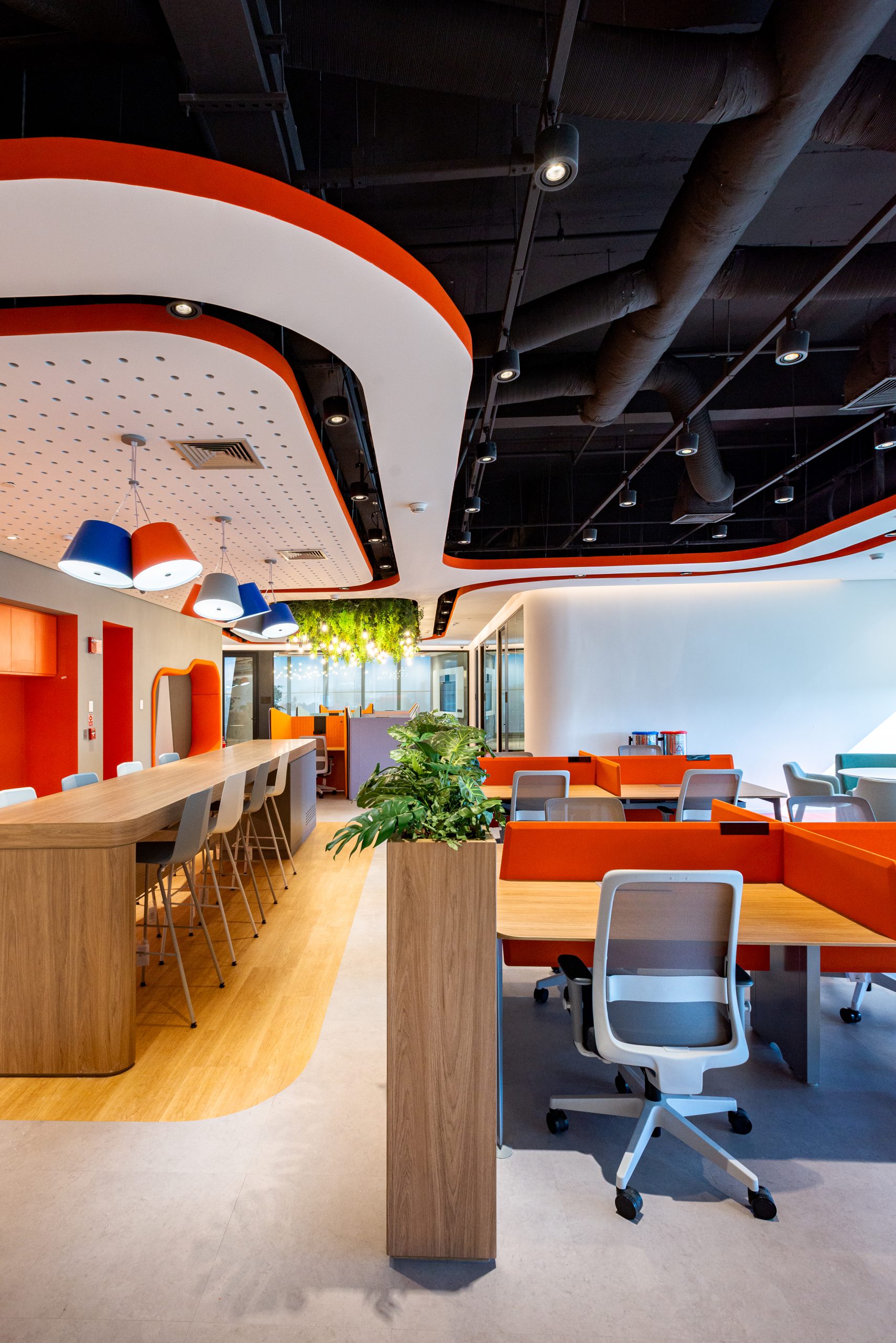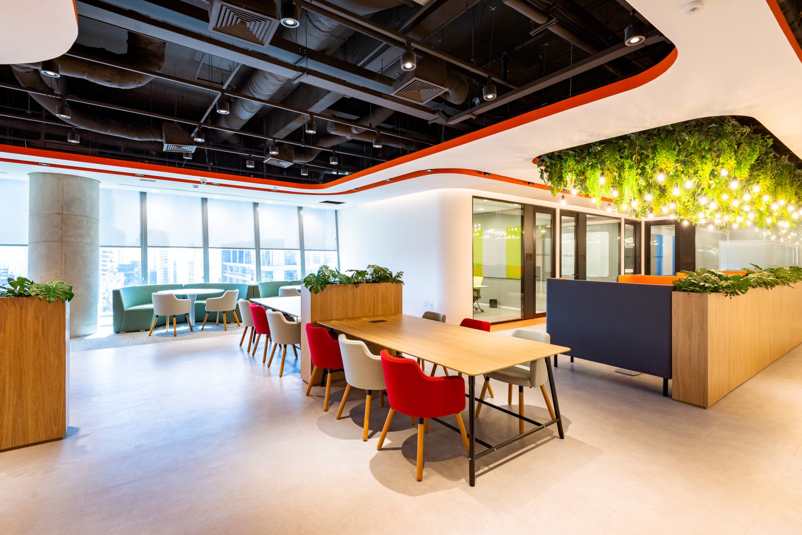 Também aplicamos soluções de Biofilia, com floreiras em todas as estações de trabalho, vasos distribuídos nos andares e salas de reunião, e vegetação suspensa nas áreas colaborativas.