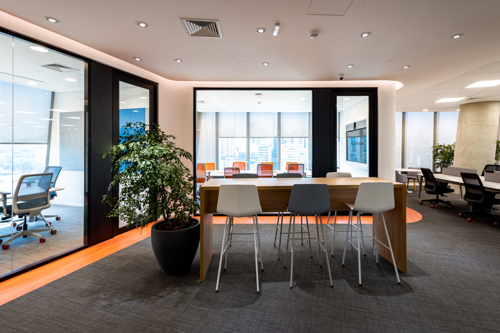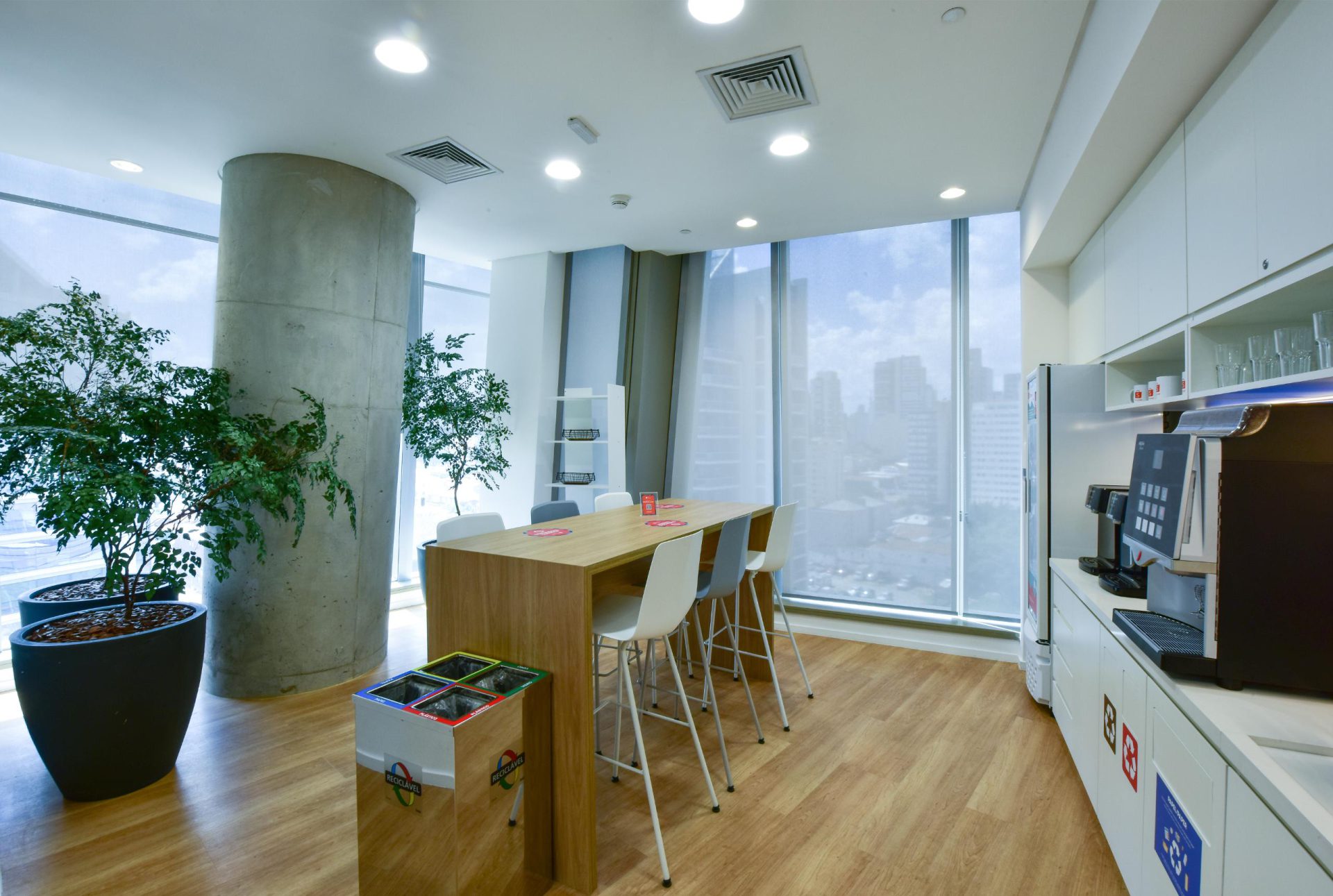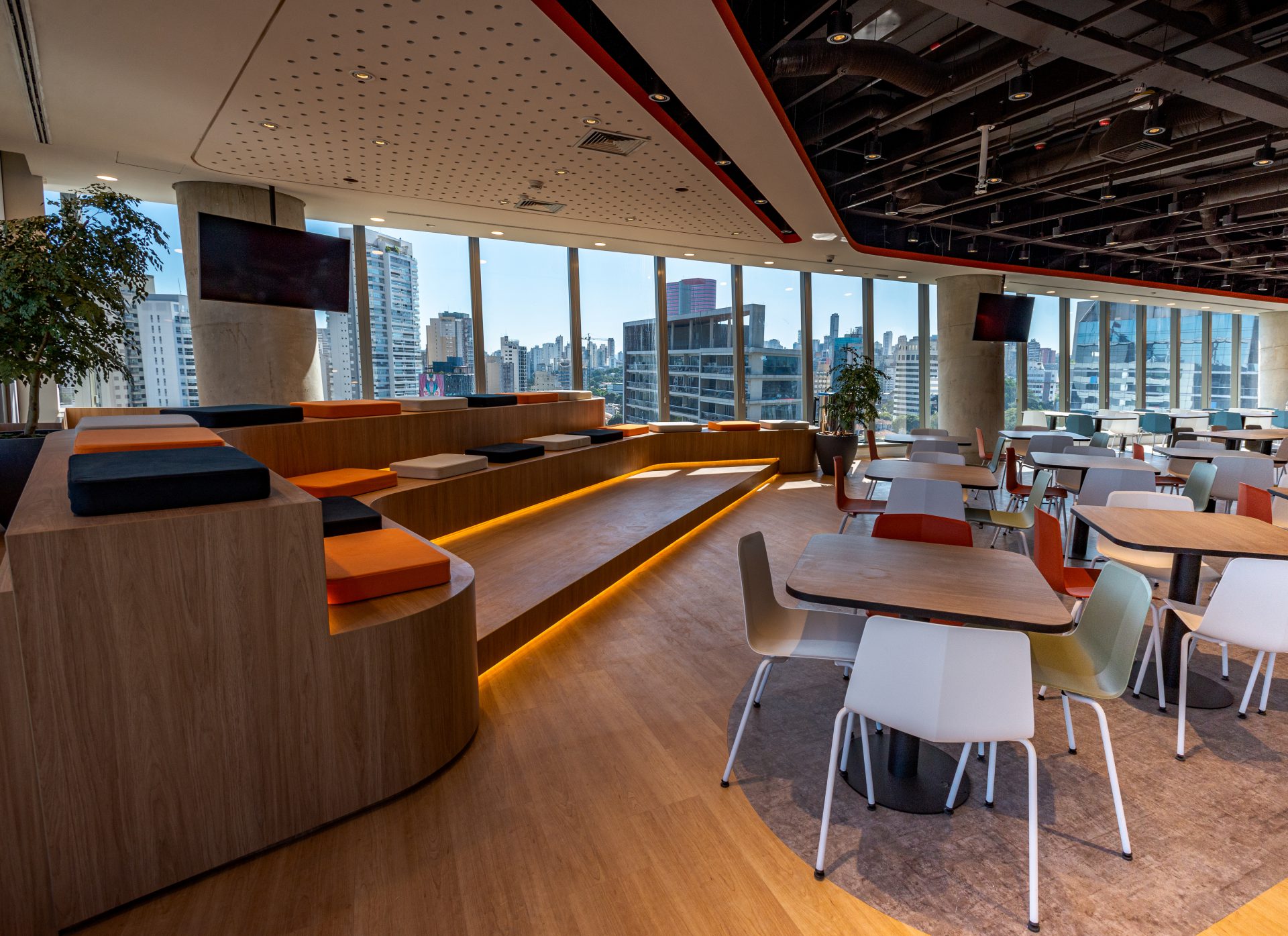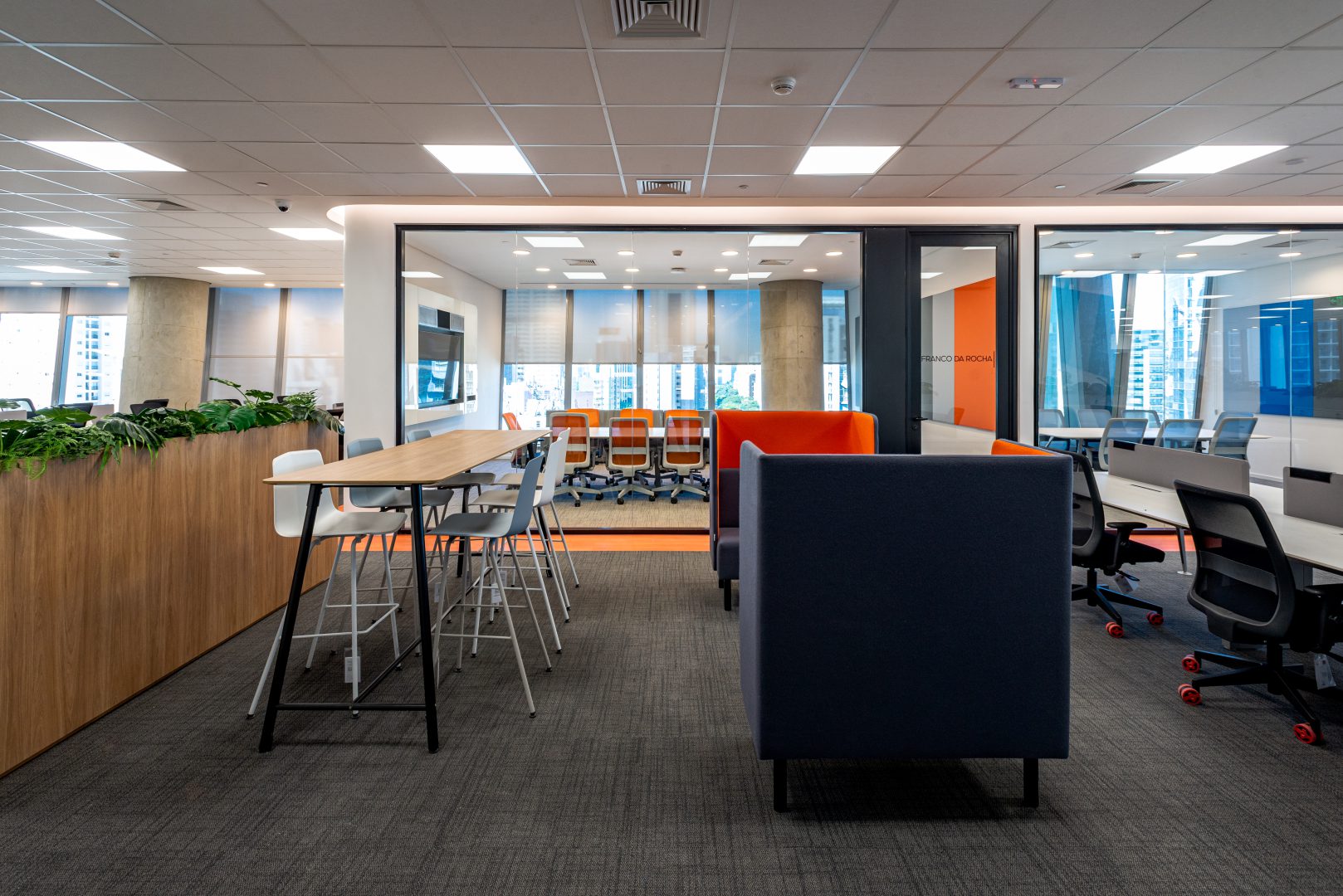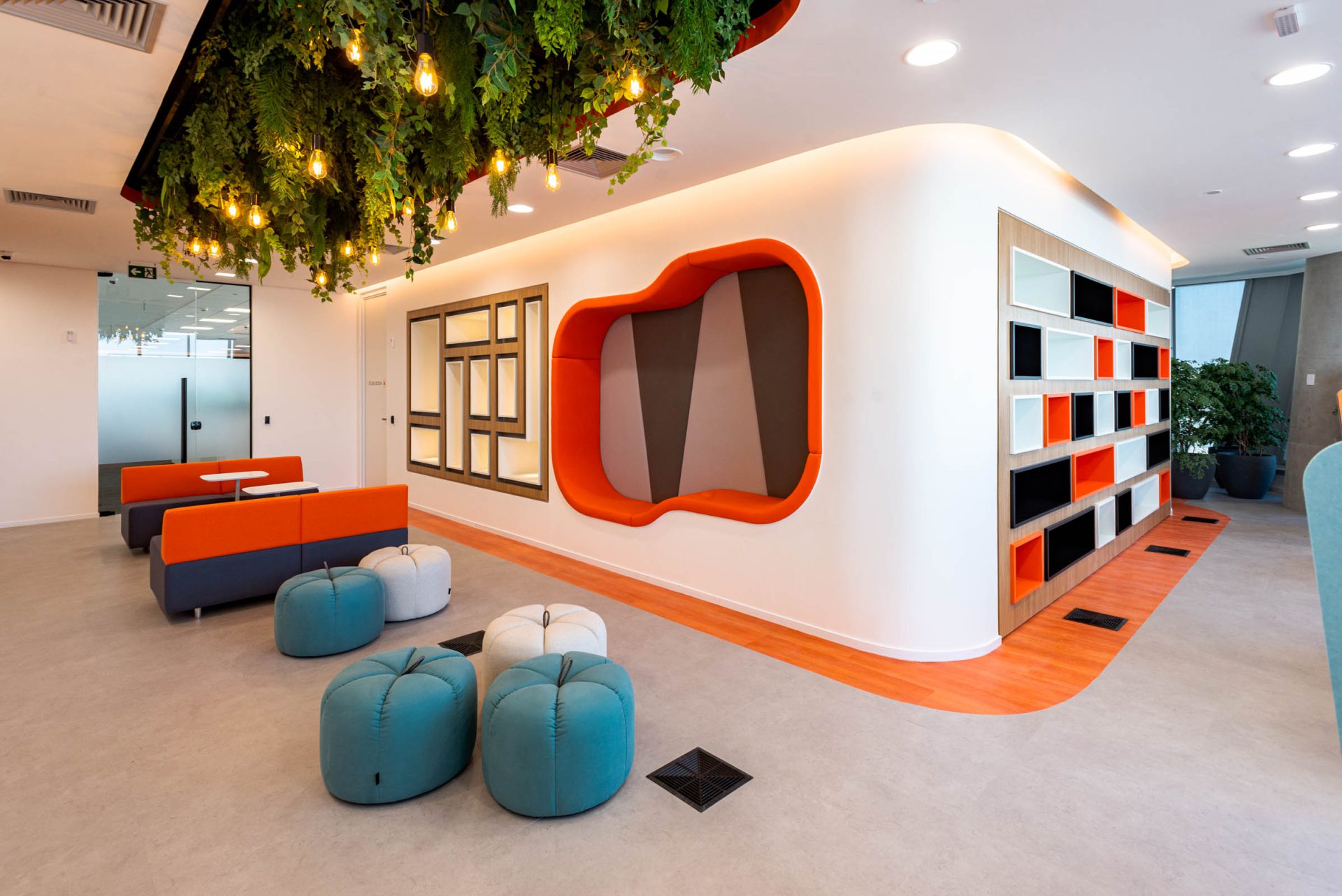 Também aplicamos soluções de Biofilia, com floreiras em todas as estações de trabalho, vasos distribuídos nos andares e salas de reunião, e vegetação suspensa nas áreas colaborativas.