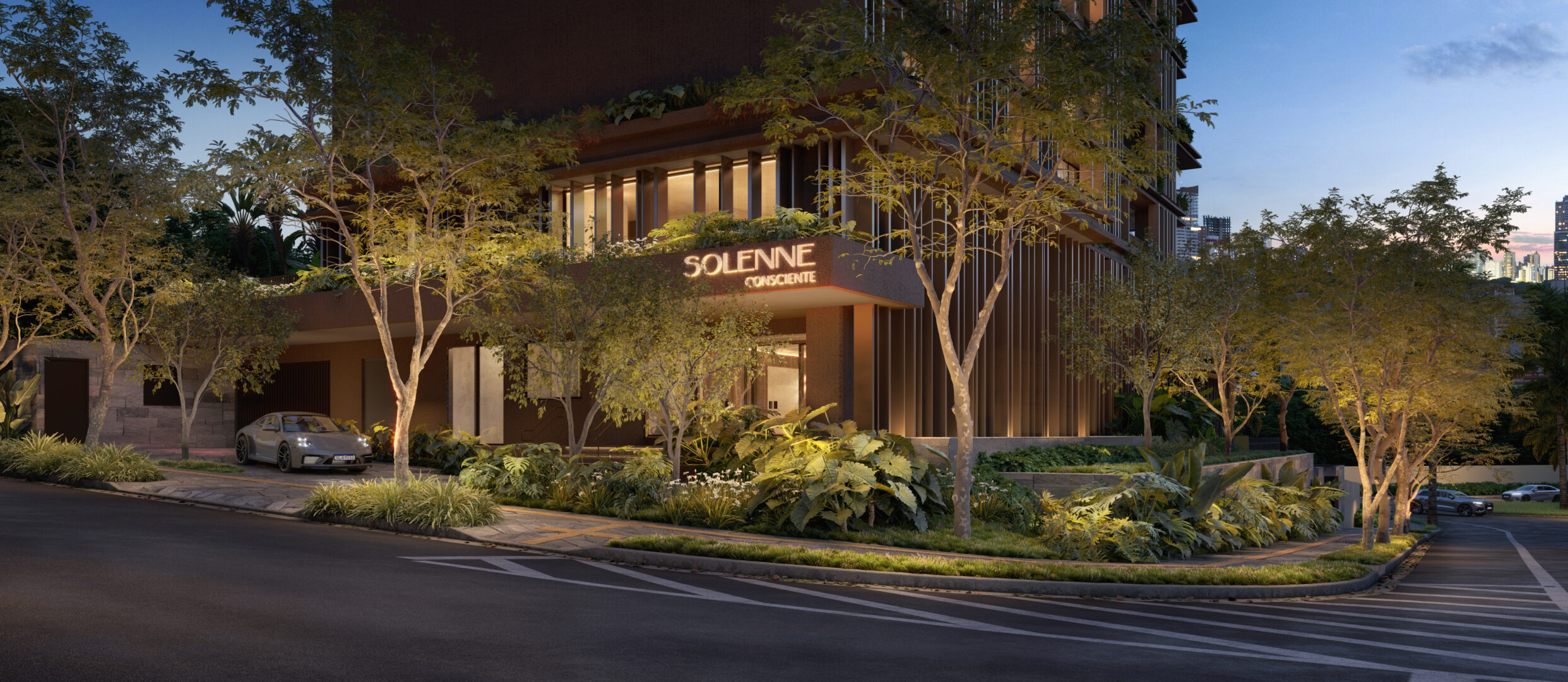 Floreiras distribuídas ao longo da fachada criam uma conexão direta com a natureza, aproximando o construído do natural e integrando o edifício ao entorno de forma sensível e sofisticada.