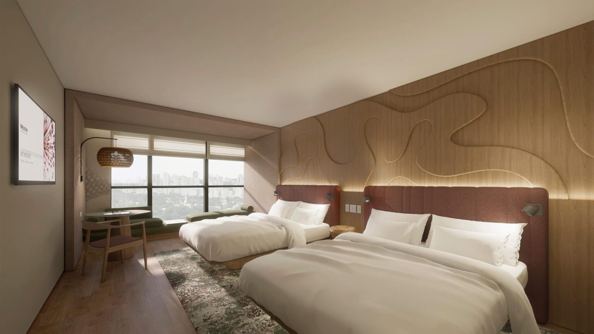 As áreas comuns e os 187 quartos foram inspirados nas formas orgânicas da natureza e buscam honrar nossas tradições, criando ambientes confortáveis e intimistas. O painel de madeira presente em todos os quartos é uma das peças de mobiliário desenhadas exclusivamente pela equipe da Zien para o hotel. Jogos de luz e sombra, criados através de diferentes camadas e enriquecidos com texturas e cores, simulam a sensação de estar em meio a natureza, despertando os sentidos.