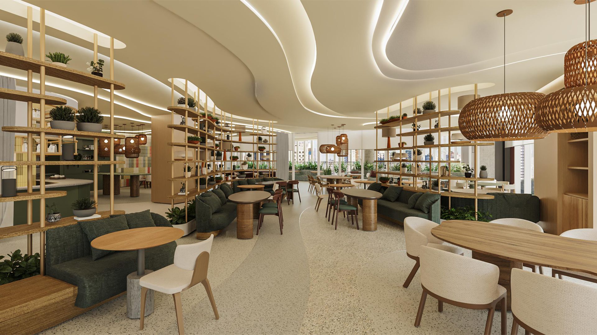 A herança de um sinuoso Rio Pinheiros que ficou para trás inspira uma relação com as águas, refletida no lobby. Elementos curvilíneos, transparências e formas orgânicas criam um ambiente acolhedor, provocando nos hóspedes uma sensação de refúgio e bem-estar logo no primeiro momento.